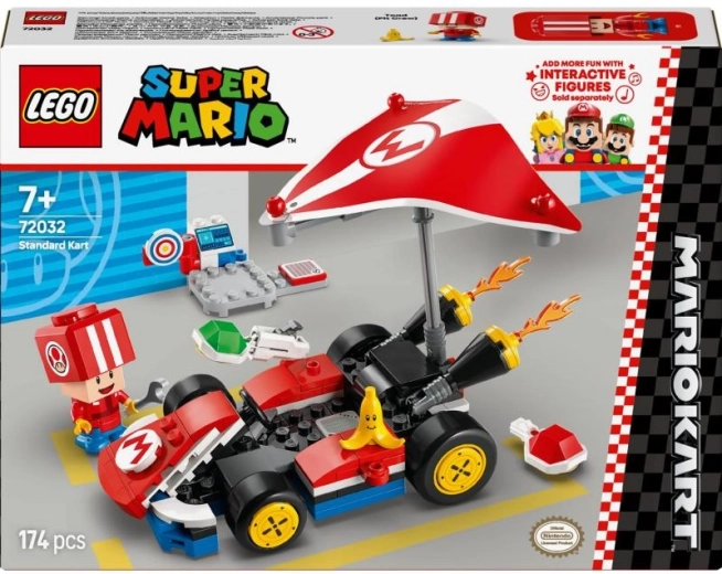 Připravte se na závodění, driftování a plachtění se setem LEGO Super Mario Mario Kart – Standardní motokára. Součástí je Toad z pit crew, odnímatelný Super Glider, kola pro drift a střílení skořápek na cíl. Propojte s interaktivními figurkami LEGO Mario, LEGO Luigi nebo LEGO Peach pro zvukové a vizuální efekty a ještě zábavnější hru.