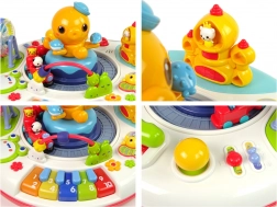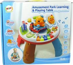 Stolek je vybaven klaviaturou s melodiemi, otočnými postavičkami a osvětlenými tlačítky ve tvaru zvířátek, které po stisknutí vydávají veselé zvuky a světelné efekty. Plastový stolek je navržen tak, aby snadno přitahoval pozornost dítěte.