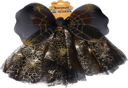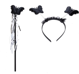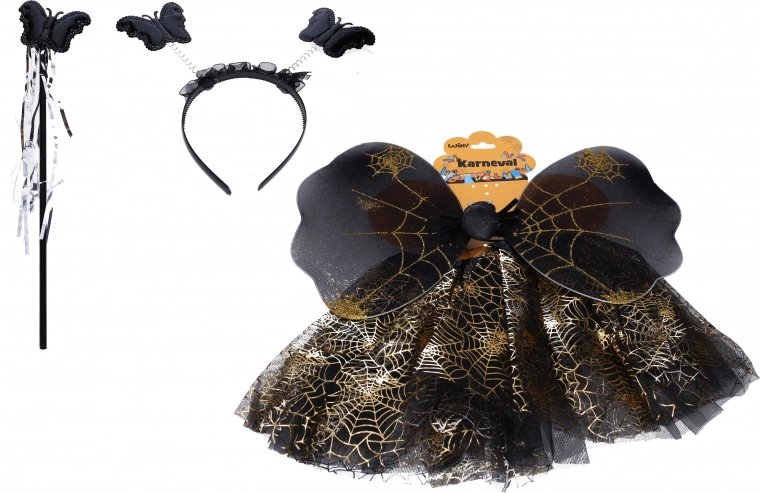 Stylový karnevalový set pro malé víly a motýlky v elegantní černé barvě. Obsahuje vše potřebné pro rychlou proměnu: křídla, sukni (délka 29 cm), kouzelnou hůlku a čelenku. Ideální na karneval, maškarní bál i pohádkové kostýmy.