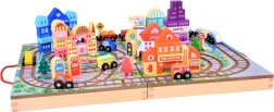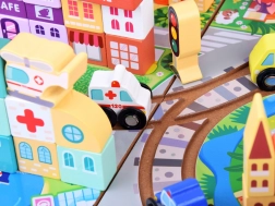 Zahrnuje různé barevné dřevěné bloky k sestavení města, které podporují kreativitu a uvědomění při stavbě.