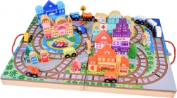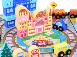 Objevte fascinující svět dřevěných staveb s touto dřevěnou sadou města, která přináší 89 prvků zábavy. Sada zahrnuje trakce, vlaky na baterie a různé barevné bloky na stavbu unikátních budov.