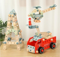 Ponořte se do světa tvořivosti s naší dřevěnou stavebnicí, která podporuje rozvoj klíčových dovedností u dětí. Tento vzdělávací set umožňuje vytvořit různé modely, jako jsou hasičské vozy, letadla, a jiné kreativní tvary.