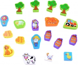 Sada obsahuje různé tvary a barvy, které pomáhají dětem rozvíjet koordinaci rukou a očí, stejně jako poznávání barev a tvarů.