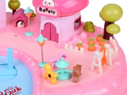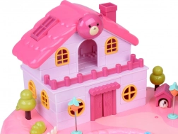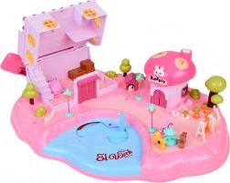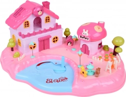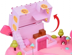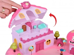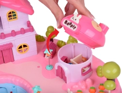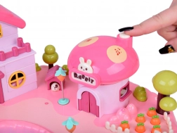 Domeček nabízí víceúrovňový interiér se scénami pro každodenní hraní: útulná ložnice s postelí, otevírací skříň, koupelna s vanou a umyvadlem, kuchyňka s lednicí i toaletní stolek. Světelné a zvukové efekty spouštěné tlačítky umocní atmosféru hry a podsvětlený nápis RABBIT reaguje do rytmu melodie.