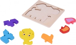 Šest větších dílků a dřevěná podložka se siluetou slona usnadňují správné vkládání a budují sebevědomí dítěte při hře.