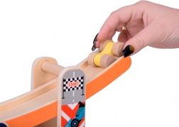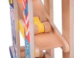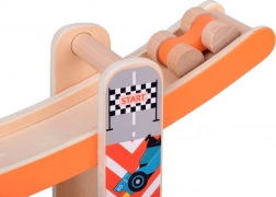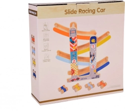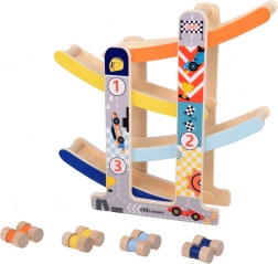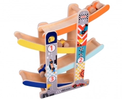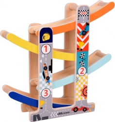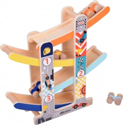 Tato robustní dřevěná skluzavka pro autíčka přináší dětem zábavu i učení v jednom. Díky čtyřem pestrobarevným drahám a čtyřem dřevěným autíčkům si děti užijí dynamické sjezdy a zároveň trénují jemnou motoriku, koordinaci oko–ruka a princip příčina–následek. Hračka je připravena k použití ihned po vybalení – bez montáže.