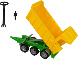 Přívěs má otevíratelné zadní čelo a naklápěcí mechanismus pro snadné vysypání nákladu. Děti mohou jezdit pouze traktorem, nebo zapojit přívěs a převážet materiál jako na skutečné farmě – ideální pro rozvoj jemné motoriky, představivosti a rolové hry.