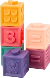 Dalších 6 kostek obsahuje písmena, čísla a matematické symboly, které pomáhají dětem naučit se základní matematiky a jazykové dovednosti. Speciální tvary a reliéfy na kostkách umožňují snadné spojování a stavění různých konstrukcí, což zároveň procvičuje jejich motorické dovednosti a koordinaci.