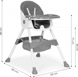 Bezpečnost zajišťuje 5bodový pás a stabilní kovové nohy s protiskluzovými koncovkami. Odnímatelný dvouvrstvý tác má vyvýšené okraje a držák na kelímek, horní vrstvu lze mýt v myčce. Skládací konstrukce šetří místo a košík pod sedákem udrží bryndáčky, ubrousky i hračky vždy po ruce.