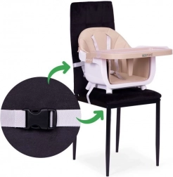 2 způsoby použití – doma i na cestách: Židličku lze používat jako klasickou vysokou židličku nebo po odejmutí noh jako nástavec na běžnou židli. Upevňovací popruhy drží sedák pevně na místě, takže si dítě vychutná bezpečné stolování kdekoli.