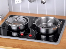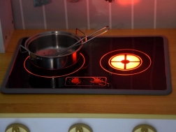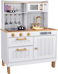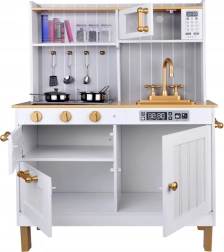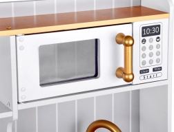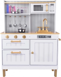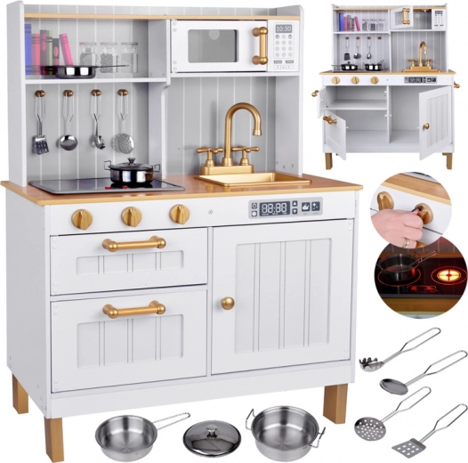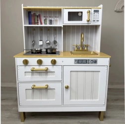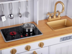 Tato dětská kuchyňka je snem každého malého šéfkuchaře – kombinuje estetický vzhled s interaktivními funkcemi. Kuchyně je vybavena mikrovlnkou, troubou a indukční varnou deskou, která vydává realistické zvuky vaření. Zlaté designové prvky dodávají na luxusu, zatímco zahloubená nerez dřez se stylovým kohoutkem dává hru nový rozměr.