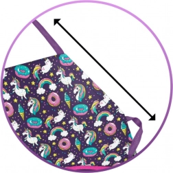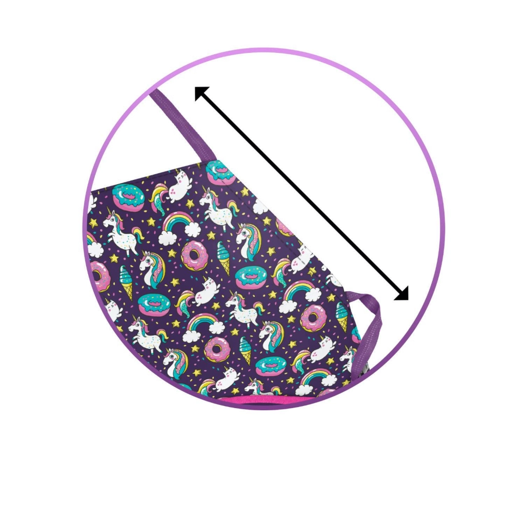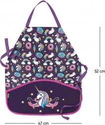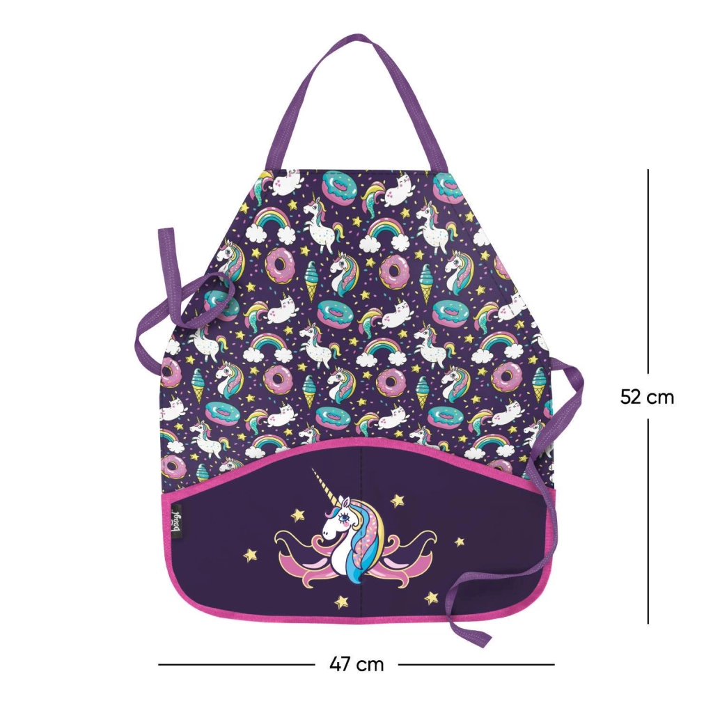 Díky nastavitelnému popruhu snadno padne různým výškám dětí. Omyvatelný a odolný materiál se rychle čistí a dvojice kapes v přední části pojme štětce, pastelky či vařečky. Barevný motiv jednorožců s duhou potěší každé kreativní dítě a podpoří radost z tvoření.