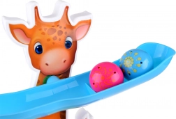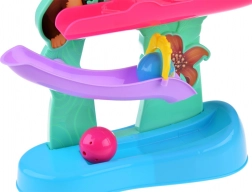 Kuličky sviští po čtyřech rampách a lákají děti k opakované hře, která rozvíjí vnímání pohybu i trpělivost.