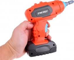 Dětská bateriová vrtačka/šroubovák, šroubovák, klíče a kleště podporují realistickou hru na řemeslníka, zatímco barevné dílky vedou děti k objevování tvarů, vzorů a principů jednoduché mechaniky. Součástí je i inspirační brožurka s nápady na stavby.