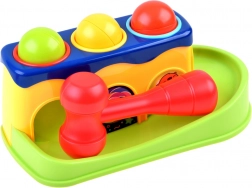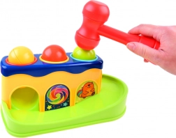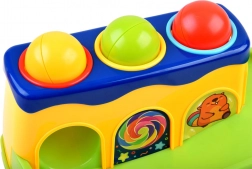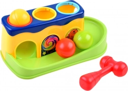 Tato interaktivní hračka přináší dětem radost z objevování: úkolem je pomocí červeného kladívka jemně uhodit do kuliček v otvorech tak, aby propadly dolů a rozjely se po skluzavce. Díky pestrým barvám a odolnému plastu, který se neodírá, si děti užijí dlouhé hodiny hravého učení.