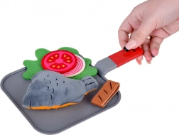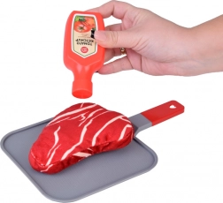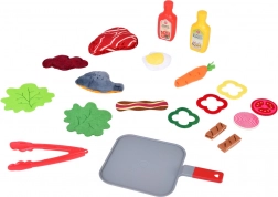 V balení najdete praktické doplňky – pánev a kleště – a pestrý výběr potravin: steak, rybu, kuřecí filet a stripsy, vejce, slaninu, plátky rajčete a cibule, listy salátu, mrkev, papriky a dvojici omáček (ketchup a univerzální dresink). Díky tomu mohou děti připravovat nespočet „receptů“ a trénovat kuchařské role.