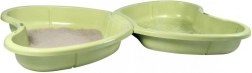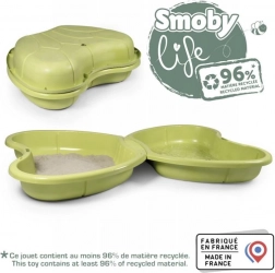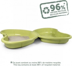 Zábavné zelené pískoviště ve tvaru motýla se dvěma do sebe zapadajícími částmi nabízí hru s pískem i vodou. Jednu část naplníte pískem, druhou vodou, a díky vodní trysce uprostřed lze snadno připojit zahradní hadici. Plastové díly s anti‑UV ochranou zajišťují odolnost a stálost barev, nechybí vypouštěcí zátka a ekologické provedení z 96 % recyklátu.