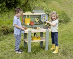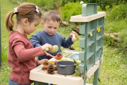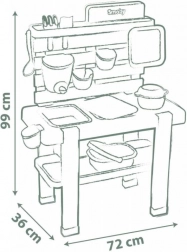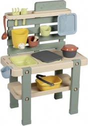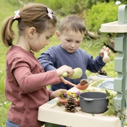 Tato odolná venkovní kuchyňka v přírodních barvách nabízí dětem autentický prostor pro hraní a experimentování s vodou, pískem a přírodními materiály. Vyjímatelné boxy usnadňují manipulaci i úklid, zatímco kohoutek s otočným uzávěrem pomáhá dávkovat vodu a rozvíjí jemnou motoriku.