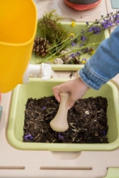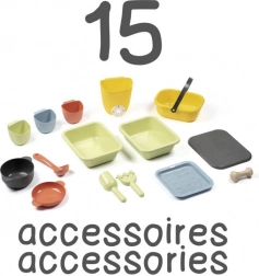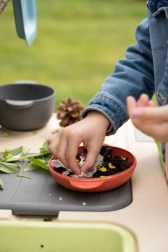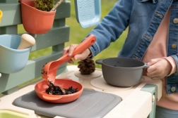 Síto, košík, naběračka, hrábě, lopatka a další příslušenství inspirují k vaření z bláta, písku i květin a podporují společnou hru.