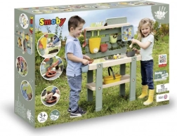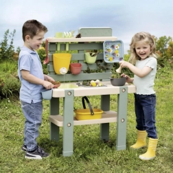 Součástí je 15 praktických doplňků (síto, košík, naběračka, hrábě, lopatka aj.), odkládací plochy, háčky a kryt zásobníku pro ukrytí a uchování „pokladů“. Konstrukce z kvalitního plastu s UV ochranou je stálobarevná a připravená na venkovní použití.