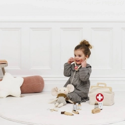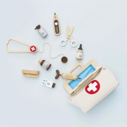 Tato unikátní veterinární brašna s příslušenstvím je ideální pro malé zvědavé veterináře. Sada obsahuje 10 ks nástrojů, které jsou vyrobeny z mořeného přírodního dřeva s certifikací FSC, což zajišťuje ekologický a udržitelný původ. Děti se mohou ponořit do světa péče o zvířátka díky revolučním nástrojům, jako jsou stetoskop, nůžky a injekční stříkačka. Brašna je navržena tak, aby podporovala kreativitu a rozvíjela představivost.