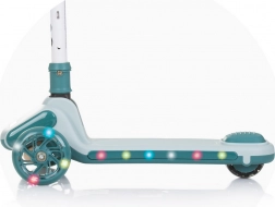Další výhodou jsou gumové protiskluzové rukojeti a široké protiskluzové stupátko, které zaručují bezpečnost během jízdy. Koloběžka je také vybavena předními i zadními koly s LED světly, což dělá jízdu atraktivnější.