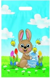 Velikonoční igelitová taška s uchem je ideálním doplňkem pro nákupy nebo přepravu velikonočních výslužek díky svým prostorným rozměrům a pevnému materiálu.