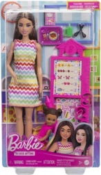 Tento set obsahuje panenku Barbie oblečenou do barevných šatů s klikatým vzorem, které podtrhují její kreativitu. Díky zahrnutým doplňkům, jako je učitelský stojan s čísly a tabulkou, se děti mohou hluboce ponořit do role učitelky.