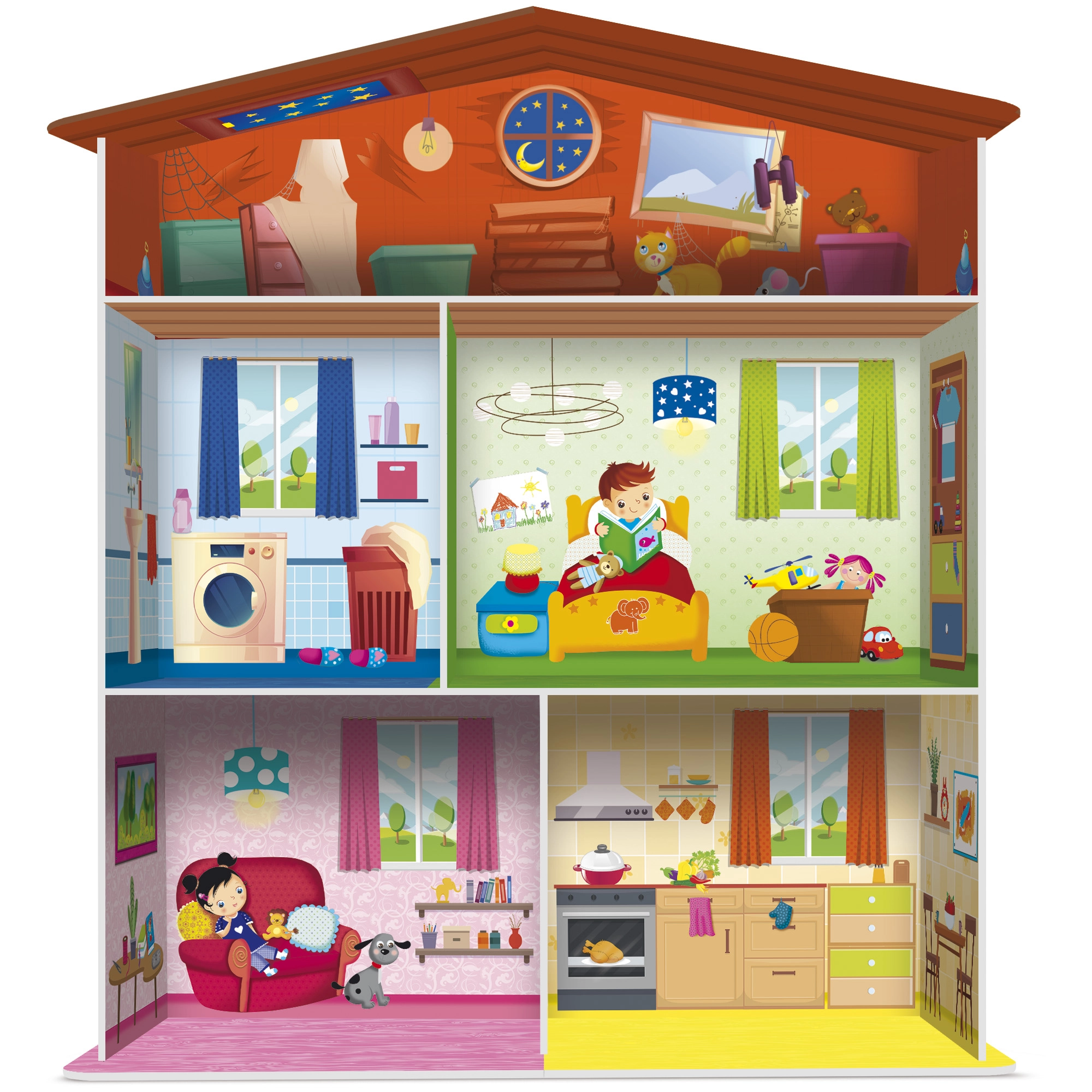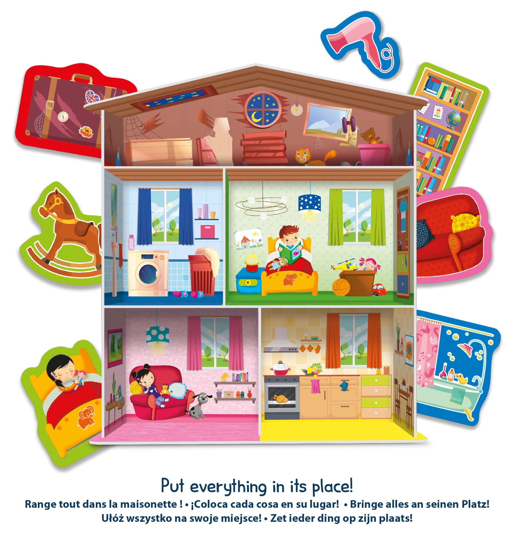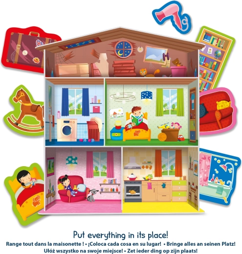 Součástí sady je domeček, puzzle ve tvaru domácího vybavení a 15 stojánků na kartičky, díky kterým lze prvky přehledně vystavit nebo je využít pro různé herní scénáře. Skvělá volba pro děti od 3 let, které se učí třídit, pojmenovávat a tvořit vlastní příběhy.