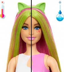 Díky speciálnímu efektu změny barvy na obličeji panenky (studená/teplá voda) se vzhled může kouzelně proměňovat znovu a znovu. Dlouhé růžovo‑zelené vlasy, kočičí čelenka a výrazné boty vytvářejí nepřehlédnutelný styl pro každé módní dobrodružství.