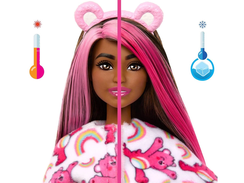 Součástí je i pramínek vlasů s efektem změny barvy – studená voda kouzlí nový odstín, teplá vrací původní barvu. Hlava kostýmu se promění v pelíšek pro mini mazlíčka a horní část kostýmu v hebkou stylovou bundičku. V balení najdete také roztomilého mini medvídka, hřeben s houbičkou a módní doplňky.