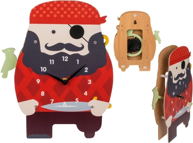 Tyto kreativní hodiny ve tvaru piráta budou zábavným prvkem v dětském pokoji. Vtipná zelená papoušek na rameni piráta se pohybuje při každé celé hodině, což vzbuzuje u dětí radost a zvědavost.