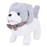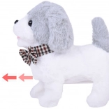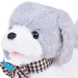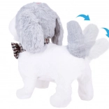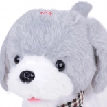 Bílo‑šedý pejsek s kostkovaným motýlkem je vyroben z mimořádně měkkého materiálu, který je skvělý na mazlení a každodenní hraní.