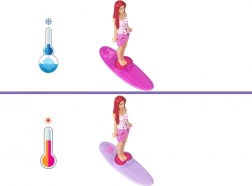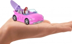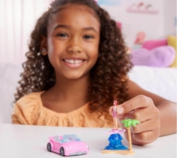 Autíčko mění barvu v studené a teplé vodě a efekt lze opakovat stále dokola. Minipanenka se ohýbá v pase, takže může sedět za volantem. Vozidlo má 2 sedadla, takže snadno rozšíříte zábavu o další figurky ze série (prodávají se samostatně). Panenka má stojánek ve tvaru srdce, který lze připevnit k dalším setům Mini Barbie Land.