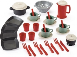Velká průhledná taška s čtyřsettalíři, příbory, pohárky, hrníčky s podšálky, konvičkou, cukřenkou, sítkem a hrncem s pokličkou. Skvělý dětský set pro zábavné hraní.