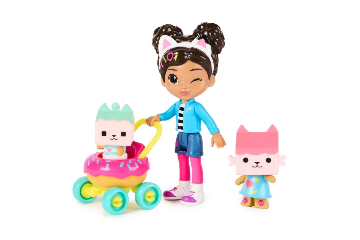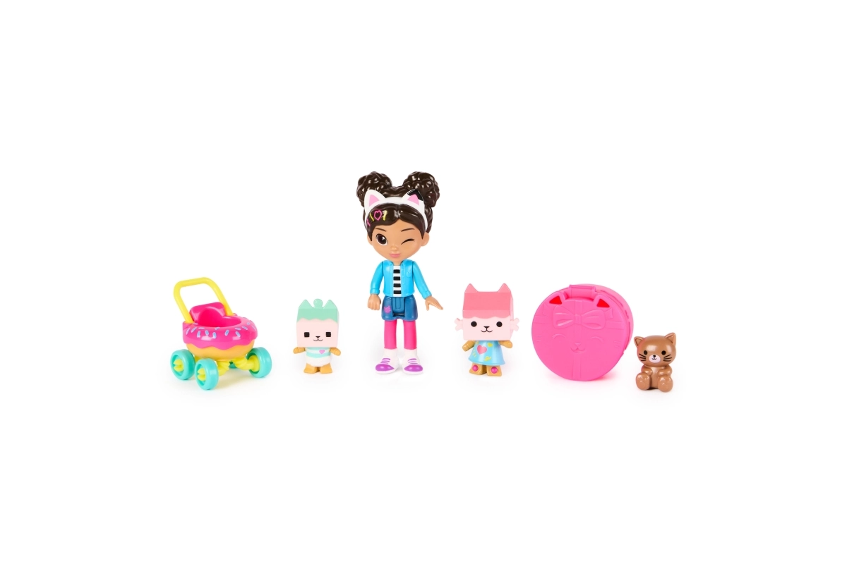 - Kompletní mini playset: Gabby, 2 kočičí figurky, kočárek–donut a tajná kapsle.