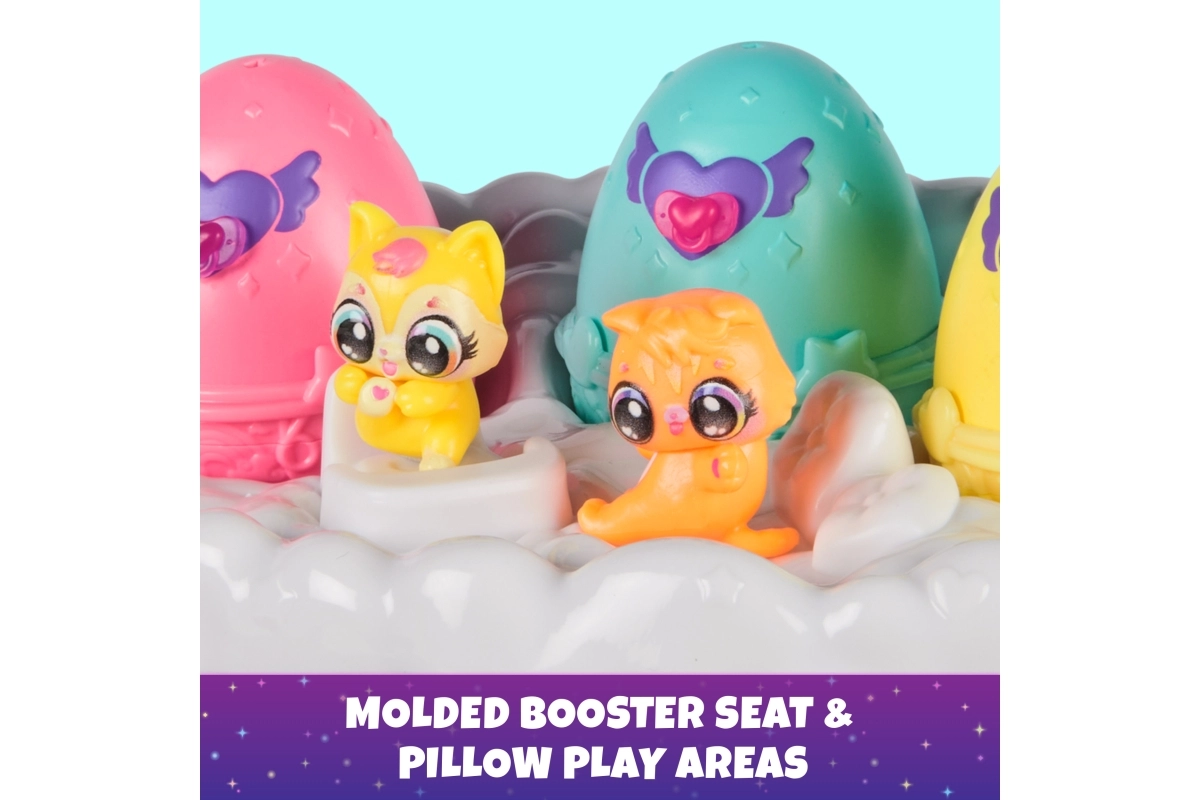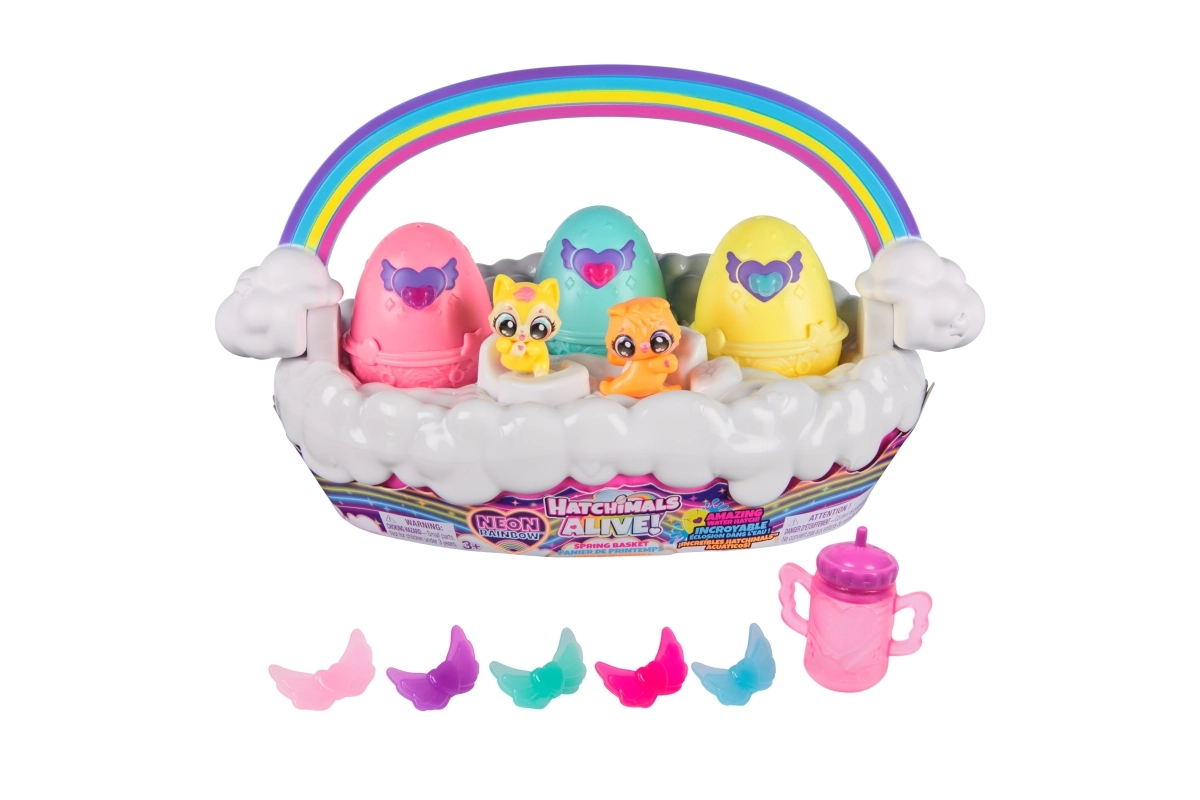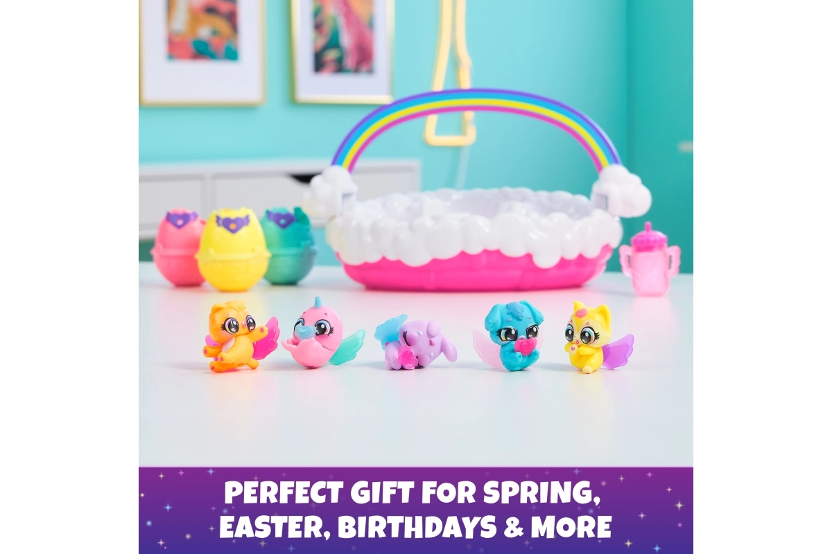 Zažijte jedinečný moment líhnutí s multi balením Hatchimals Mráček s neónovou duhou. Stačí vytáhnout dudlíky z vajíček, naplnit lahvičku vodou a jemně ji vymáčknout do vajíček – během pár sekund se začnou objevovat nové postavičky: Bunnypie, Puppadee a Narwing. Mimo vajíčko na vás čekají i Kittingale a Foxstritch. Vše si vystavíte v jarním košíku s vytvořeným sedátkem a polštářkem.