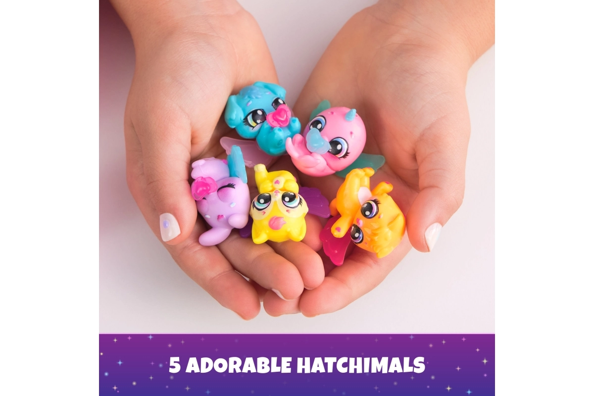 - 3 vajíčka Hatchimals, 2 figurky mimo vajíčko (Kittingale, Foxstritch), 3 figurky ve vajíčkách (Bunnypie, Puppadee, Narwing), lahvička na vodu, dudlíky, košík se sedátkem a polštářkem