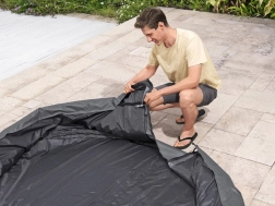 Montáž je rychlá a intuitivní. Nastavitelný obvodový pás se zabezpečovacími klipy zajistí pevné uchycení, zatímco integrovaný zip umožní bezproblémové napojení na čerpadlo bez nutnosti kryt sundávat. Kryt je kompatibilní s modely Lay‑Z‑Spa St. Moritz, Monaco, Santorini HydroJet Pro a dalšími kulatými vířivkami o průměru 216 cm.