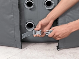 Nastavitelný pás se sponami zajistí perfektní usazení, zip dovolí připojit vestavěné i externí čerpadlo bez sundávání krytu.