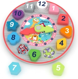 Barevná dřevěná vkládačka ve tvaru hodin pomáhá dětem hravou formou poznávat čísla, hodiny a minuty a zároveň rozvíjí jemnou motoriku a vnímání barev. Každé číslo má samostatný vyndavací tvar, který děti snadno uchopí a vloží na správné místo.