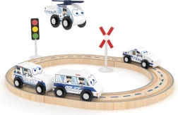 Sada obsahuje celkem 16 dílů včetně kolejí a policajních vozidel, které lze snadno skládat a rozšiřovat o další dřevěné sety.