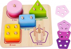 Na dřevěné základně jsou vyznačena čísla 1–5 a názvy tvarů v angličtině, což přirozeně podporuje základy cizího jazyka. Hračka je hladce opracovaná, bezpečná a barevně atraktivní, takže skvěle podněcuje zrakové vnímání i chuť objevovat.