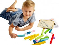 Vše se ukládá do dřevěné desky. Hladké hrany a netoxické barvy zajišťují bezpečné používání pro děti od 3 let.