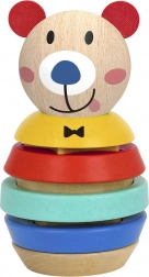 Dřevěná pyramida s medvídkem spojuje hru a učení. Barevné kroužky, hvězdičky a další tvary se skládají na tyč a do správných pozic, což podporuje logické myšlení a prostorovou představivost. Děti si hravou formou osvojují třídění podle tvaru, barvy a velikosti.