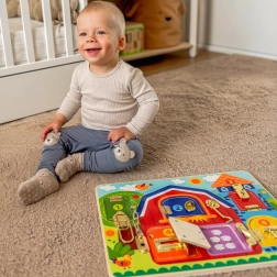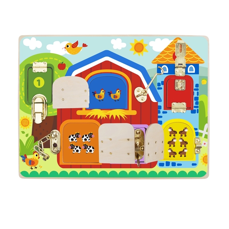 Tato kvalitní dřevěná tabule nabízí 6 okének na pantech s různými mechanismy – od klasických západek po řetízky a háčky. Děti si procvičí prsty, soustředění i trpělivost, když budou každý zámek otevírat a zavírat, aby objevily roztomilé obrázky zvířat.