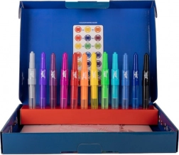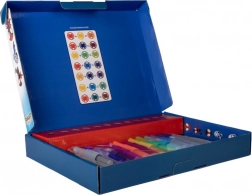 Přehledné uložení fixů i šablon v pevném papírovém boxu – ideální pro domácí tvoření i cestování.