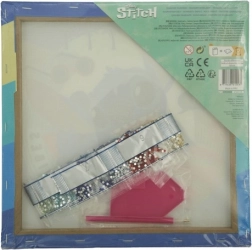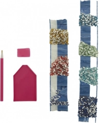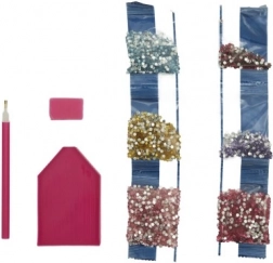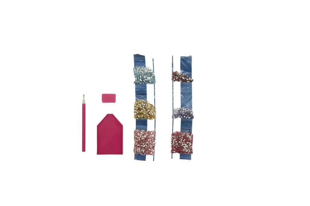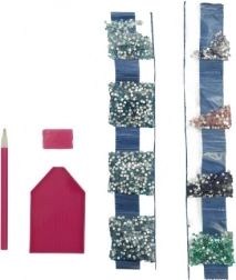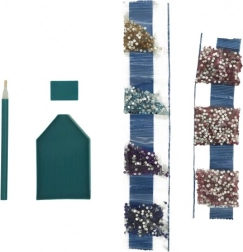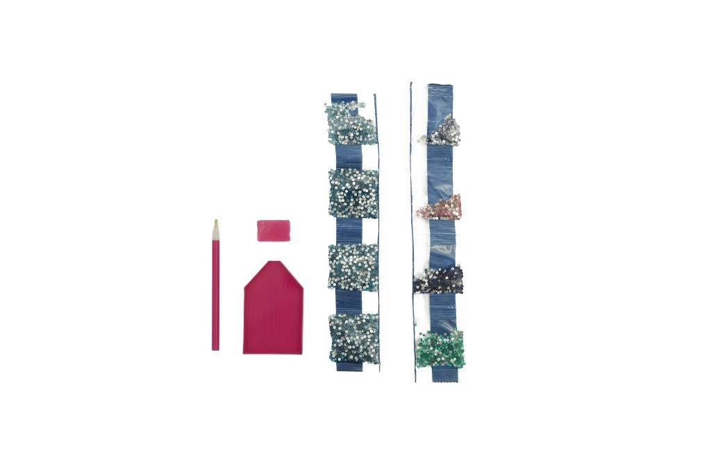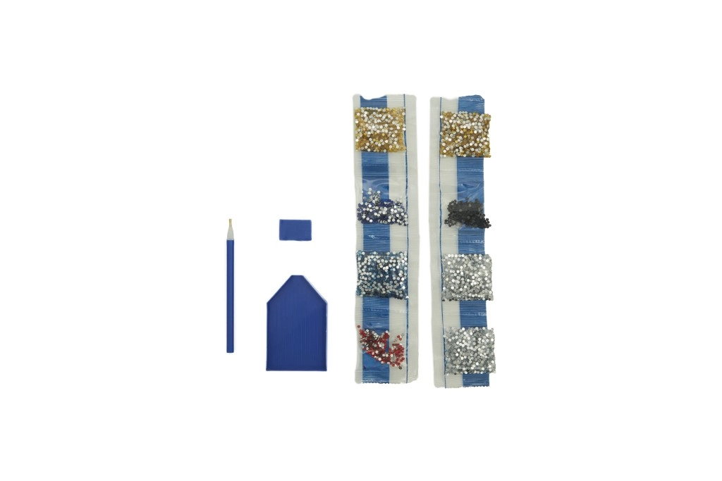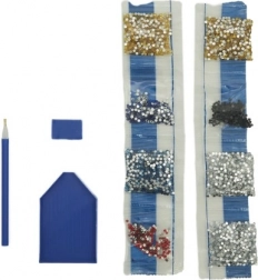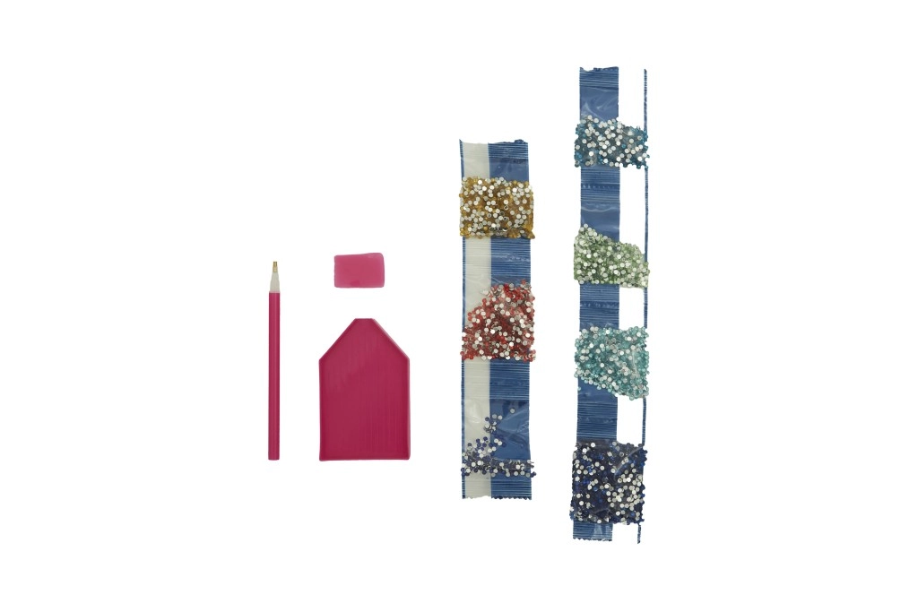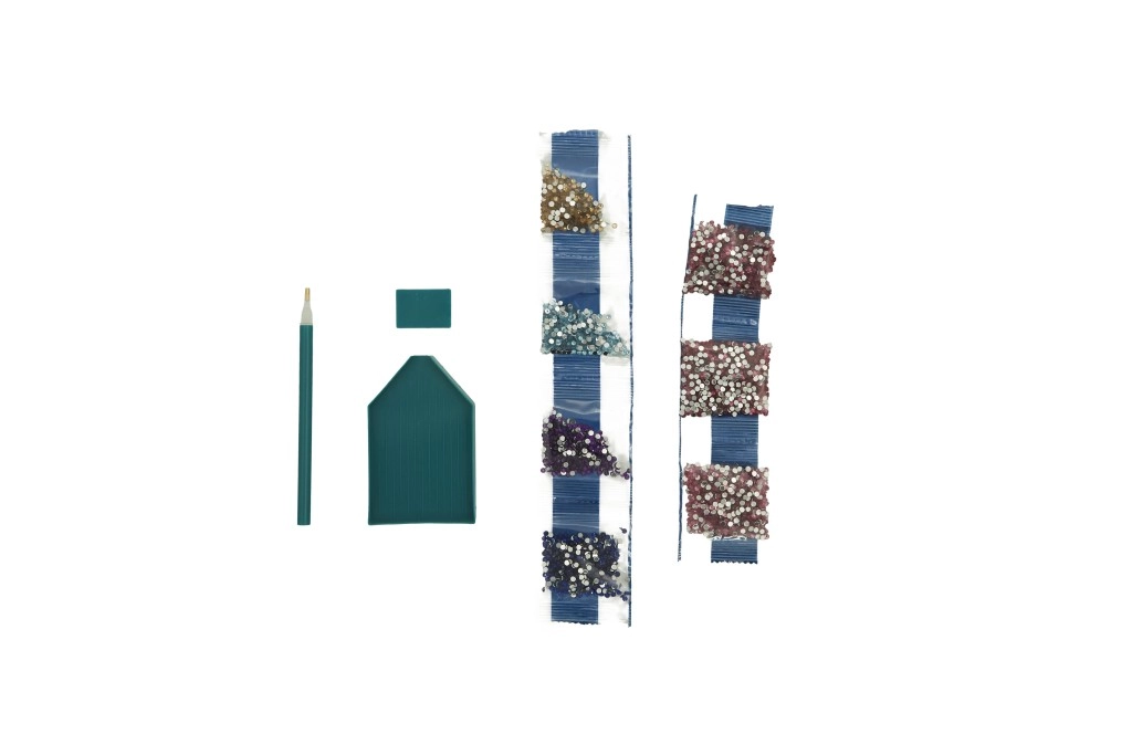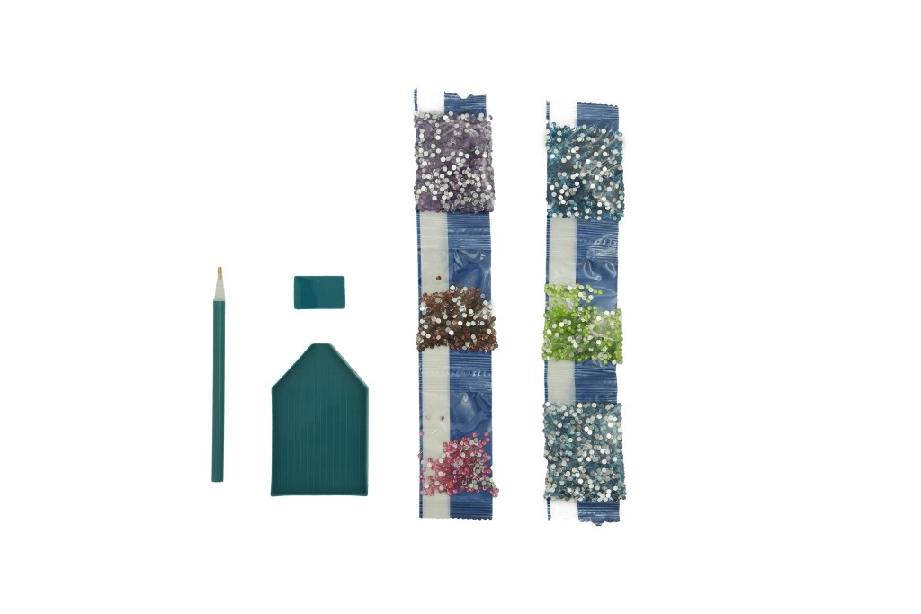 - Kompletní balení: samolepicí plátno 29 × 29 cm, barevné kamínky, aplikátor, miska a vosk.