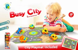 Zábavná sada pro malé řidiče přináší 5 autíček ideální velikosti do dětské ruky a praktickou podložku město s cestami. Podporuje rozvoj jemné motoriky, trénink úchopu a fantazii při hraní. Vhodné od 18 měsíců.