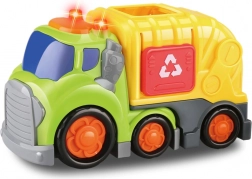 Popelářský vůz Kiddy Go! s světelnými a zvukovými efekty, otevíracím nákladovým prostorem a volnoběžnými kolečky. Součástí je popelnice a pytle s odpadem, 2× AA baterie jsou v balení. Vhodné od 18 měsíců.